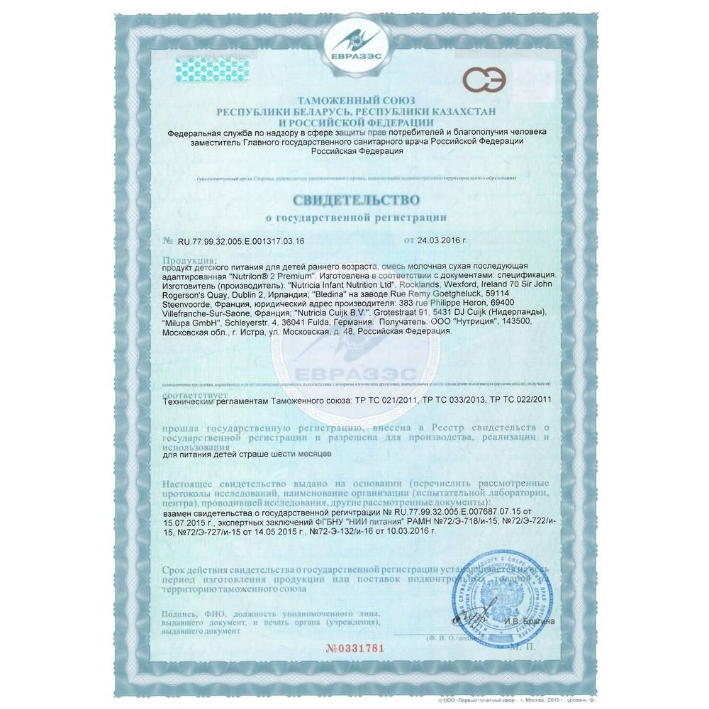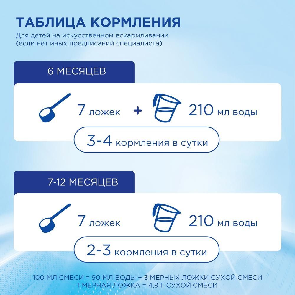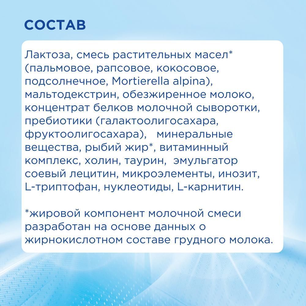 Смесь молочная сухая последующая адаптированная «Nutrilon® 2 Premium». Для питания детей старше 6 месяцев. Формула нового поколения с уникальным комплексом Pronutri+ помогает Вашему ребёнку развиваться: • Пребиотики GOS/FOS способствуют развитию собственной здоровой микрофлоры кишечника и поддерживают иммунитет ребёнка, помогая снижать риск возникновения аллергии и инфекций. • Улучшенный комплекс особых жирных кислот ARA/DHA способствует развитию его интеллекта. • Сбалансированный комплекс витаминов и минералов, разработанный специально с учетом потребностей детей до года, способствует правильному росту ребенка. Nutricia уже более 30 лет занимается изучением грудного молока. Благодаря многолетним научным исследованиям молочные смеси Nutrilon по составу и основным свойствам приблизились к совершенству. Грудное молоко – лучшее питание для детей раннего возраста. Premium=Премиальный. Pronutri+=Пронутри+. ВАЖНО: • Для питания детей раннего возраста предпочтительнее грудное вскармливание. • Nutrilon используется как заменитель грудного молока, если грудное вскармливание невозможно. • Перед применением смеси проконсультируйтесь cо специалистом. • Несоблюдение инструкций по приготовлению и хранению смеси может нанести вред здоровью ребенка. • Никогда не оставляйте Вашего ребенка одного во время кормления. • Для детского питания. • Не допускается назначать детям, имеющим аллергию на любой компонент, входящий в состав продукта.