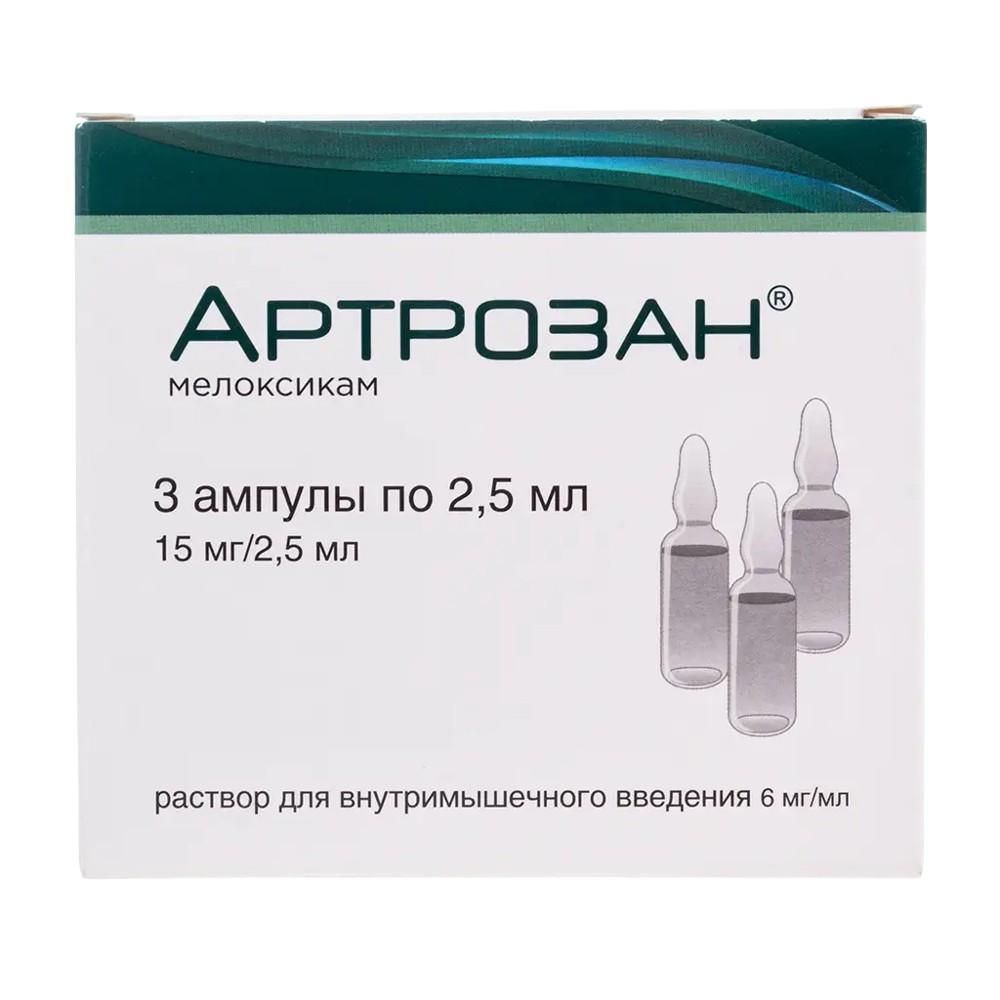 Остеоартрит с болевым синдромом: 7,5 мг в сутки. При необходимости эта доза может быть увеличена до 15 мг в день.Ревматоидный артрит: 15 мг в сутки. В зависимости от лечебного эффекта эта доза может быть снижена до 7,5 мг в день.Анкилозирующий спондилит: 15 мг в сутки. В зависимости от лечебного эффекта эта доза может быть снижена до 7,5 мг в день.У пациентов с повышенным риском побочных реакций (заболевания желудочно-кишечного тракта в анамнезе, наличие факторов риска сердечно-сосудистых заболеваний) рекомендуется начинать лечение с дозы 7,5 мг в день (см. раздел «Особые указания»).У пациентов с выраженной почечной недостаточностью, находящихся на гемодиализе, доза не должна превышать 7,5 мг в день., Общие рекомендацииТак как потенциальный риск побочных реакций зависит от дозы и продолжительности лечения, следует использовать максимально возможные низкие дозы и длительность применения. Максимальная рекомендуемая суточная доза - 15 мг., Комбинированное применениеНе следует применять препарат одновременно с другими НПВП. Суммарная суточная доза препарата Артрозан®, применяемого в виде разных лекарственных формах, не должна превышать 15 мг.Внутримышечное введение препарата показано только в течение первых нескольких дней терапии. В дальнейшем лечение продолжают с применением пероральных лекарственных форм. Рекомендуемая доза составляет 7,5 мг или 15 мг 1 раз в сутки, в зависимости от интенсивности болей и тяжести воспалительного процесса.Препарат вводится посредством глубокой внутримышечной инъекции.Препарат нельзя вводить внутривенно.Учитывая возможную несовместимость, Артрозан®, раствор для внутримышечного введения не следует смешивать в одном шприце с другими лекарственными средствами.