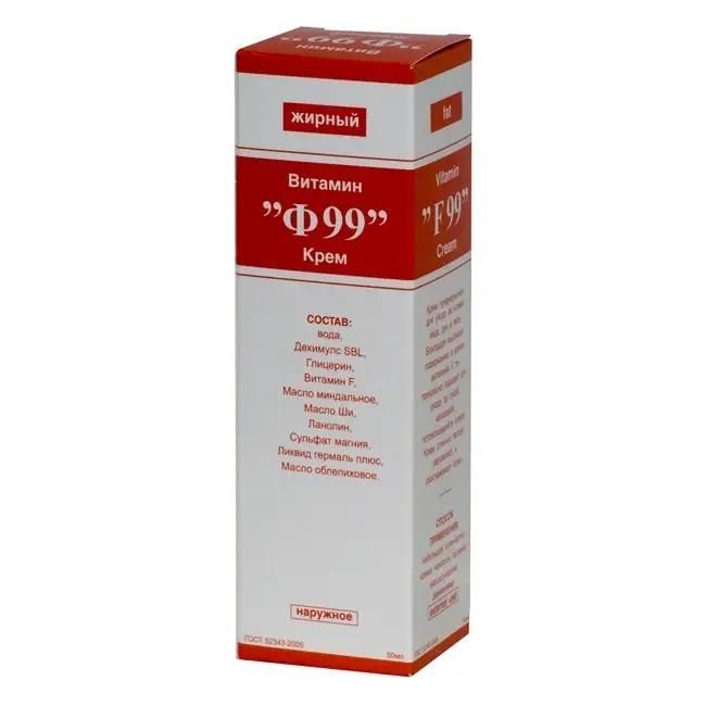 Витамин Ф99 в виде жирного крема – эффективная помощь при различного рода кожных раздражениях. Эффективен при порезах, ожогах, ссадинах, сухой экземе, атоническом дерматите. Способствует заживлению трещин и мелких ран, обладает бактерицидным и регенерирующим действием. Ф99 жирный – отличное средство по уходу за шершавой сухой кожей. Активным веществом выступает витамин Ф, ускоряющий эпителизацию пораненных мест и повышающий барьерные характеристики кожи.