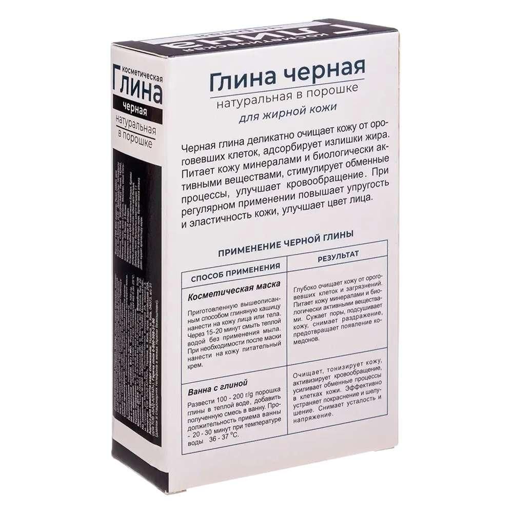 Чёрная глина деликатно очищает кожу от ороговевших клеток и загрязнений, адсорбирует излишки жира, ускоряет процесс регенерации. , Питает кожу минералами и биологически активными веществами, стимулирует обменные процессы, улучшает кровообращение. , Сужает поры, нормализует работу сальных желёз. Снимает воспаление, подсущивает и устраняет угревую сыпь. , Предотвращает появление камедонов. , В компрессах снимает воспаление, нормализует кровообращение, стимулирует обменные процессы.