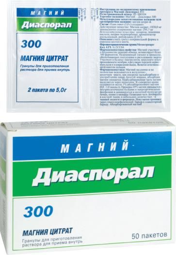 Внутрь., Взрослым и детям старше 12 лет — по 1 пакету Магний-Диаспорал 300 ежедневно. , Растворить содержимое 1 пакета в 0.5 стакана фруктового сока, чая или воды., Обычно продолжительность лечения составляет один месяц.