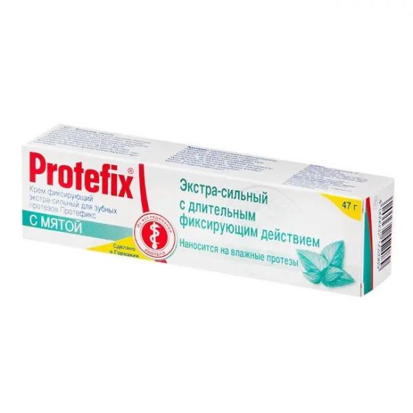 Крем для фиксации зубных протезов Protefix (Протефикс):, можно использовать при повышенном слюноотделении;, обеспечивает надежную фиксацию при воздействии горячей и холодной воды;, не имеет побочных эффектов (изменение вкусовых ощущений, влияние на желудок);, позволяет зафиксировать протез до 10 часов;, не влияет на прикус;, создает ощущение свежести, благодаря наличию ментола в составе крема.