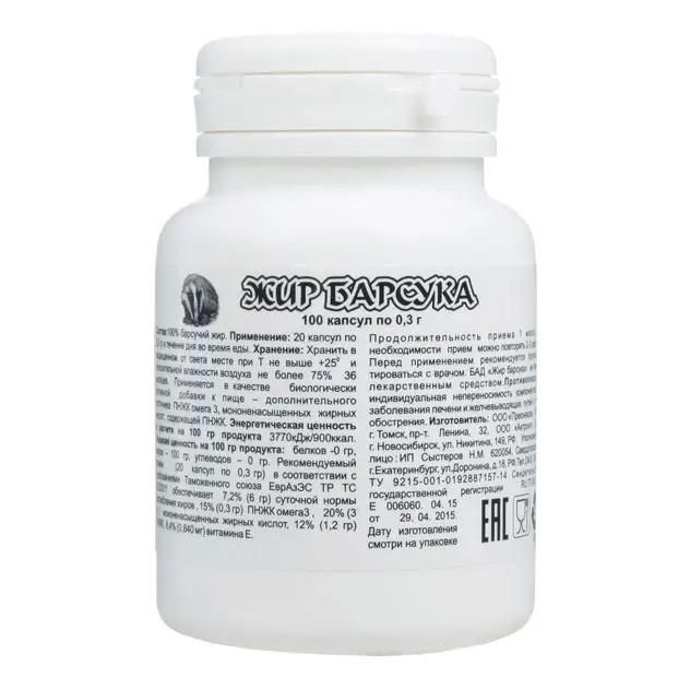 Барсучий жир - ценный лечебный продукт. Его целебные свойства объясняются накоплением биологически активных веществ, необходимым животному для сохранения нормальной жизнедеятельности в течение нескольких месяцев спячки без пищи и воды., Широко применяется в официальной и народной медицине более 200 лет, как высокоэффективный, естественный лечебно-профилактический препарат., Барсучий жир при приеме внутрь полностью на 100 % усваивается в крови, обогащая её витаминами, необходимыми организму микроэлементами и органическими кислотами., При приеме барсучьего жира усиливается белковый обмен, повышается иммунитет организма, регулируется правильность кроветворительной системы., Барсучий жир оказывает бактерицидное действие, на туберкулёзные бациллы. Нормализуется секреторная деятельность желудка и кишечника, повышается эмоциональный тонус. Погашаются гнойные процессы, закрываются свищи и очаги, очищаются раны и организм идёт на выздоровление.