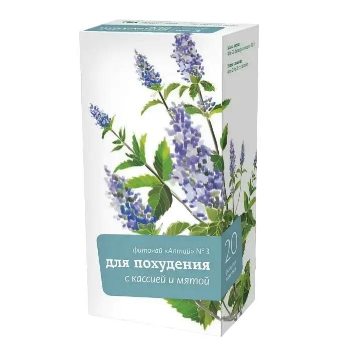 Фиточай «Алтай» №3 «Для похудения с кассией и мятой» рекомендуется людям с повышенным весом для оптимизации питания. Кассия и мята в составе фитосбора оказывают на организм мягкое очистительное действие, способствуют быстрому выведению шлаков и токсинов, помогают процессу похудения, нормализации жирового обмена и улучшению состояния кожи., Лекарственные травы, входящие в состав фитосбора:, • Листья кассии узколистной (сенны) - эффективное слабительное средство растительного происхождения. Способствует выведению шлаков и токсинов, быстро освобождает кишечник, не вызывая болевых ощущений. Используется в программах детокс и похудения., • Трава и листья володушки многожильчатой усиливают деятельность поджелудочной железы и печени, действуют как мягкое слабительное и тонизирующее средство., • Плоды кориандра снимают спазмы, успокаивают, стимулируют восстановление поврежденных тканей, используются как мягкое слабительное средство., • Столбики с рыльцами кукурузы способствуют понижению аппетита. Обладают мочегонным, желчегонным, противовоспалительным действием. Применяются для нормализации обмена веществ и использования во время курса лечения избыточного веса., • Листья подорожника большого применяются для улучшения работы желудочно-кишечного тракта. Обладают секретолитическим, противовоспалительным, бактериостатическим, седативным и кровоочищающим действием., • Плоды шиповника майского богаты натуральным витамином С. Способствуют нормализации обмена веществ, омоложению клеток всего организма, повышению их жизненной силы., • Трава и листья мяты перечной снижают процессы брожения в кишечнике, успокаивают, оказывают ветрогонное и спазмолитическое действие., О серии БАД «Фиточай Алтай», Серия «Фиточай Алтай» — это уникальные фитокомпозиции из дикорастущих алтайских трав для поддержания слаженной работы всех систем организма человека., В серии – 36 наименований по направлениям: для сердечно-сосудистой, нервной и бронхо-легочной систем, для желудочно-кишечного тракта, печени и желчевыводящих путей, для почек и мочевыводящих путей, для суставов, для снижения уровня сахара в крови, для женского и мужского здоровья, а также для очищения организма и снижения веса., Фитосборы, приготовленные на основе лекарственных алтайских трав, являются отличной заменой привычному чаю и несоизмеримы по своей пользе и положительному влиянию на здоровье. Они обладают по-настоящему живительной силой., Специалисты компании «Алтайский кедр» сделали каждый фитосбор уникальным, благодаря авторским рецептам, научным исследования и тщательному подбору компонентов. Все фитокомпозиции способствуют решению конкретной проблемы, а также укрепляют защитные силы организма и просто доставляют удовольствие от чаепития.