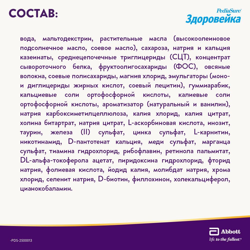 вода, мальтодекстрин, растительные масла (высокоолеиновое подсолнечное масло, соевое масло), сахароза, натрия и кальция казеинаты, среднецепочечные триглицериды (СЦТ), концентрат сывороточного белка, фруктоолигосахариды (ФОС), овсяные волокна, соевые полисахариды, магния хлорид, эмульгаторы (моно- и диглицериды жирных кислот, соевый лецитин), гуммиарабик, кальциевые соли ортофосфорной кислоты, калиевые соли ортофосфорной кислоты, ароматизатор (натуральный и ванилин), натрия карбоксиметилцеллюлоза, калия хлорид, калия цитрат, холина битартрат, натрия цитрат, L-аскорбиновая кислота, инозит, таурин, железа (II) сульфат, цинка сульфат, L-карнитин, никотинамид, D-пантотенат кальция, меди сульфат, марганца сульфат, тиамина гидрохлорид, рибофлавин, ретинола пальмитат, DL-альфа-токоферола ацетат, пиридоксина гидрохлорид, фторид натрия, фолиевая кислота, йодид калия, молибдат натрия, хрома хлорид, селенит натрия, D-биотин, филлохинон, холекальциферол, цианокобаламин.