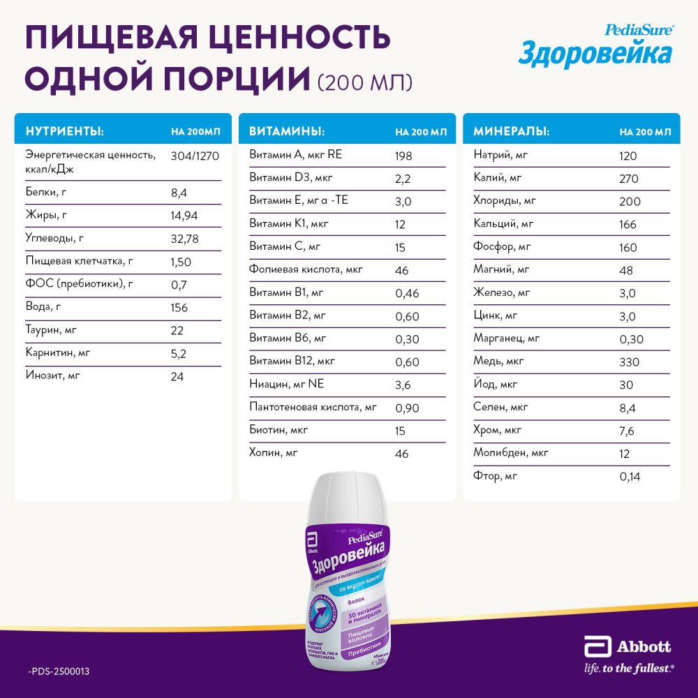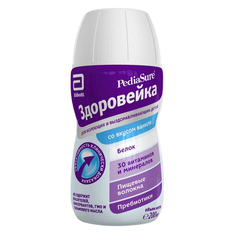 В период болезни и выздоровления аппетит ребенка снижается, а потребность в энергии и питательных веществах возрастает. Чтобы восполнить силы и поддержать иммунитет, попробуйте предложить малышу ПедиаШур Здоровейка: напиток со вкусом ванили содержит важные нутриенты, необходимые организму на пути к восстановлению*. Продукт предназначен для питания детей от 1 года до 10 лет и подходит для ежедневного употребления.