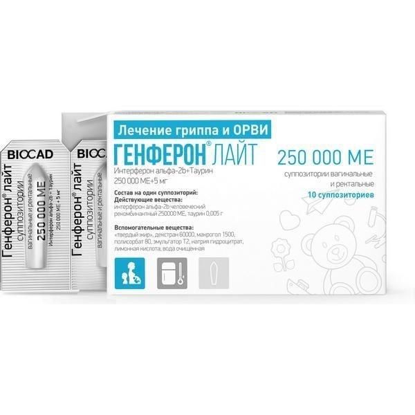Препарат может применяться как вагинально, так и ректально. Способ введения, доза и длительность курса зависят от возраста и конкретной клинической ситуации. У взрослых и детей старше 7 лет Генферон® Лайт применяют в дозе 250 000 МЕ интерферона альфа-2b на суппозиторий. У детей до 7 лет, включая детей грудного возраста, безопасным является применение препарата в дозе 125 000 МЕ интерферона альфа-2b на суппозиторий. У женщин, находящихся на 13-40 неделе беременности, препарат применяется в дозе 250 000 МЕ интерферона альфа-2b на суппозиторий., Рекомендуемые дозы и режимы лечения:, Острые респираторные вирусные инфекции и другие острые заболевания вирусной природы у детей: по 1 суппозиторию ректально 2 раза в день с 12-часовым интервалом параллельно основной терапии в течение 5 дней. Если по истечении 5-дневного срока лечения симптомы заболевания не уменьшаются или становятся более выраженными, пациенту следует обратиться к врачу. По клиническим показаниям возможен повтор курса лечения после 5-дневного интервала., Острые респираторные вирусные инфекции у часто и длительно болеющих детей в возрасте от 3 до 6 лет: по 1 суппозиторию (125 000 МЕ) ректально 2 раза в сутки с интервалом в 12 часов в течение 10 дней параллельно стандартной терапии. После завершения основного периода лечения острой респираторной вирусной инфекции возможен переход на профилактическую схему: по 1 суппозиторию (125 000 МЕ) ректально 1 раз на ночь через день в течение 3-х недель., Хронические инфекционно-воспалительные заболевания вирусной этиологии у детей старше 7 лет: по 1 суппозиторию (250 000 МЕ) ректально 2 раза в день с 12-часовым интервалом параллельно стандартной терапии в течение 10 дней. Затем в течение 1-3 месяцев – по 1 суппозиторию ректально на ночь через день., Острые инфекционно-воспалительные заболевания урогенитального тракта у детей: по 1 суппозиторию ректально 2 раза в день с 12-часовым интервалом в течение 10 дней на фоне назначаемой и контролируемой врачом специфической терапии., Инфекционно-воспалительные заболевания урогенитального тракта у беременных: по 1 суппозиторию (250 000 МЕ) вагинально 2 раза в день с 12-часовым интервалом в течение 10 дней на фоне назначаемой и контролируемой врачом специфической терапии.