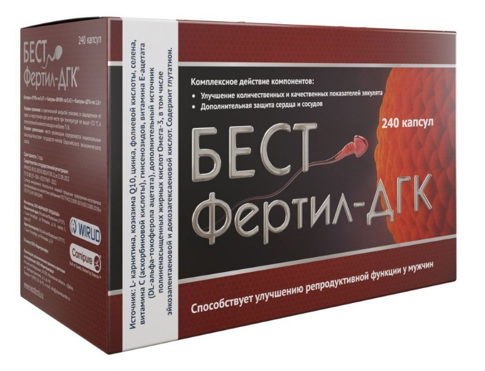 БЕСТФертил-ДГК - биологически активная добавка к пище - источник L-карнитина, коэнзима Q10, цинка, фолиевой кислоты, селена, витамина С (аскорбиновой кислоты), гинсенозидов, витамина Е-ацетата (DL-альфа-токоферола ацетата), дополнительный источник полиненасыщенных жирных кислот Омега-3, в том числе эйкозапентаеновой и докозагексаеновой кислот, содержит глутатион. Способствует улучшению репродуктивной функции у мужчин.