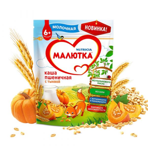 Малютка каши – родные каши с родных полей! В основе наших рецептов – отборные злаки с российских полей Алтая, Ставрополья, Краснодара, выращенные и отобранные по высоким стандартам качества. Создавая наши каши, специалисты компании Nutricia вдохновлялись природой регионов России. Каждая порция содержит необходимые для развития белки, витамины и минералы, а также углеводы, которые дают малышу энергию для роста. Каши Малютка – вся сила России для вкусного и высококачественного прикорма вашего малыша. С 6 месяцев. Новые вкусы – новые открытия. - Родные каши с родных полей; - Энергия для роста; - Без консервантов и красителей; - Без соли; -С витаминами и минералами. Каша молочная сухая быстрорастворимая пшеничная с тыквой для питания детей с 6 месяцев Малютка®. Для оптимального роста, развития и здоровья малыша Всемирная Организация Здравоохранения рекомендует исключительно грудное вскармливание в первые 6 месяцев жизни и последующее введение прикорма при продолжении грудного вскармливания. Nutricia полностью поддерживает данные рекомендации. Проконсультируйтесь со специалистом перед началом использования продукта. Для детского питания. Рекомендуется готовить кашу непосредственно перед употреблением. Никогда не используйте остатки готового питания для последующего кормления. При введении прикорма рекомендуется приучать ребенка есть его с ложечки. После каждого приготовления питания тщательно закрывайте упаковку. Не допускается назначать детям, имеющим аллергию на любой компонент, входящий в состав продукта.